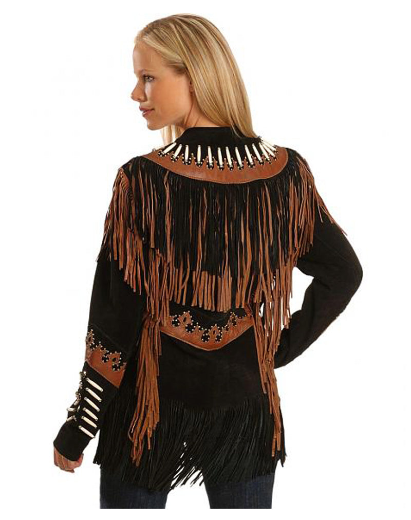 Black Suede Leather Fringe Bone Jacket For Women WWJ716
