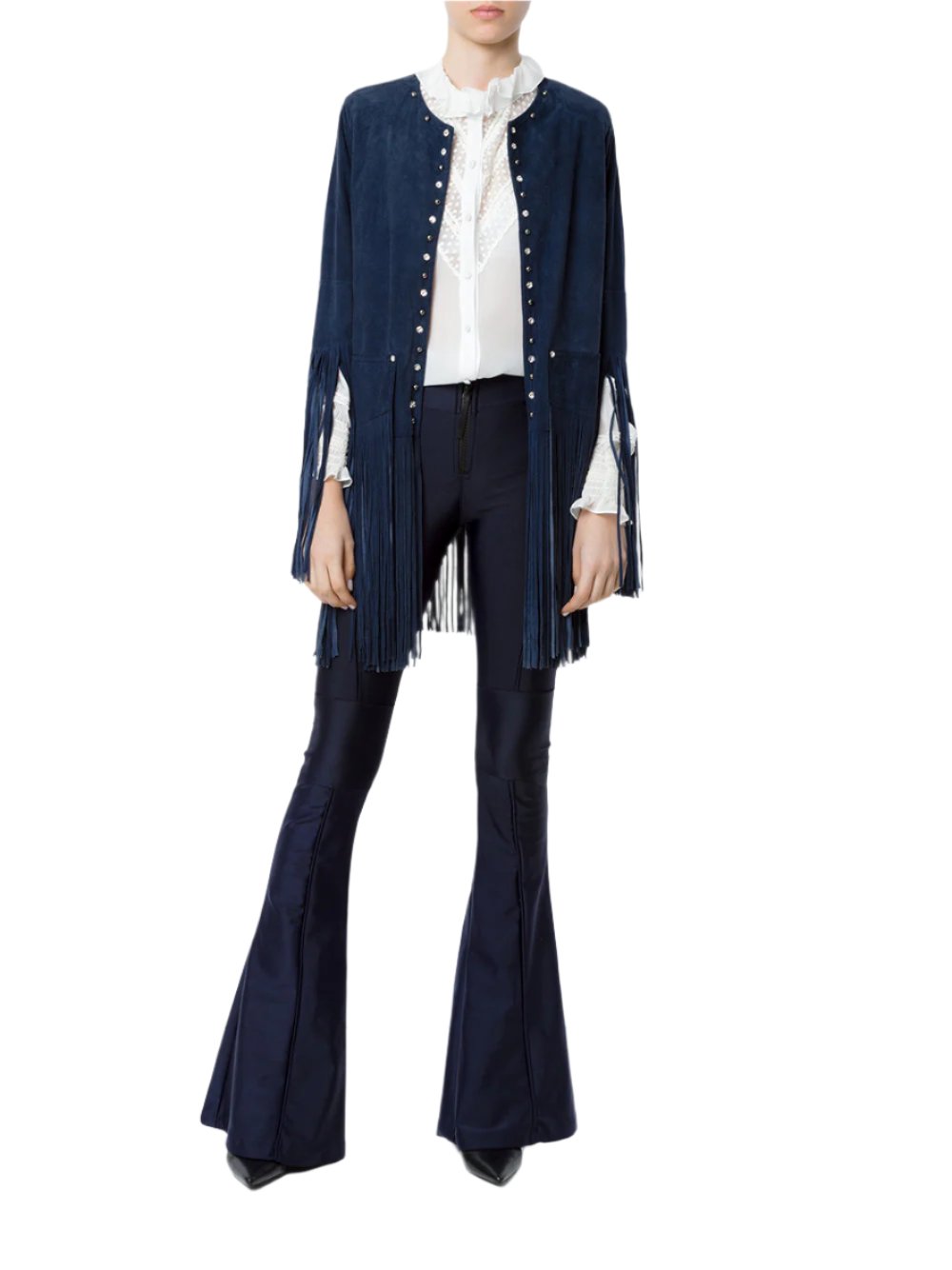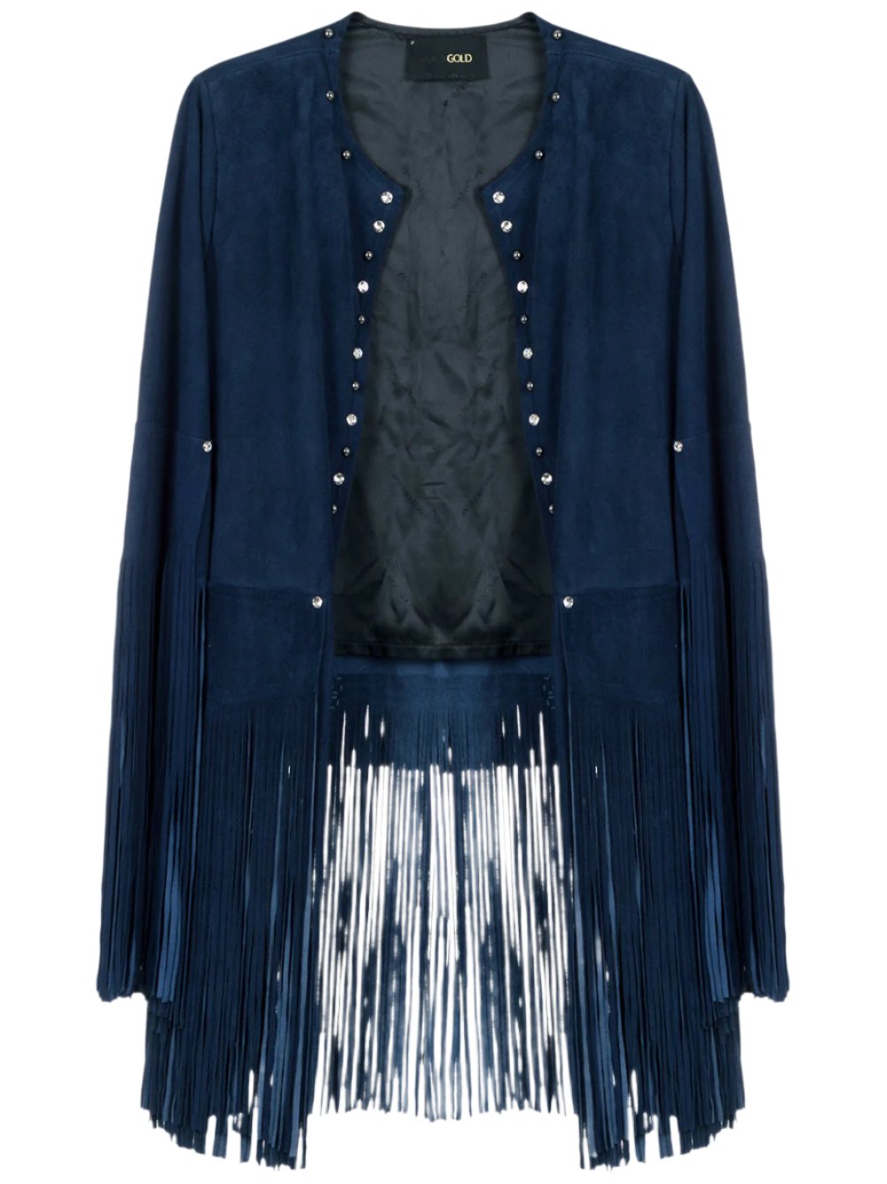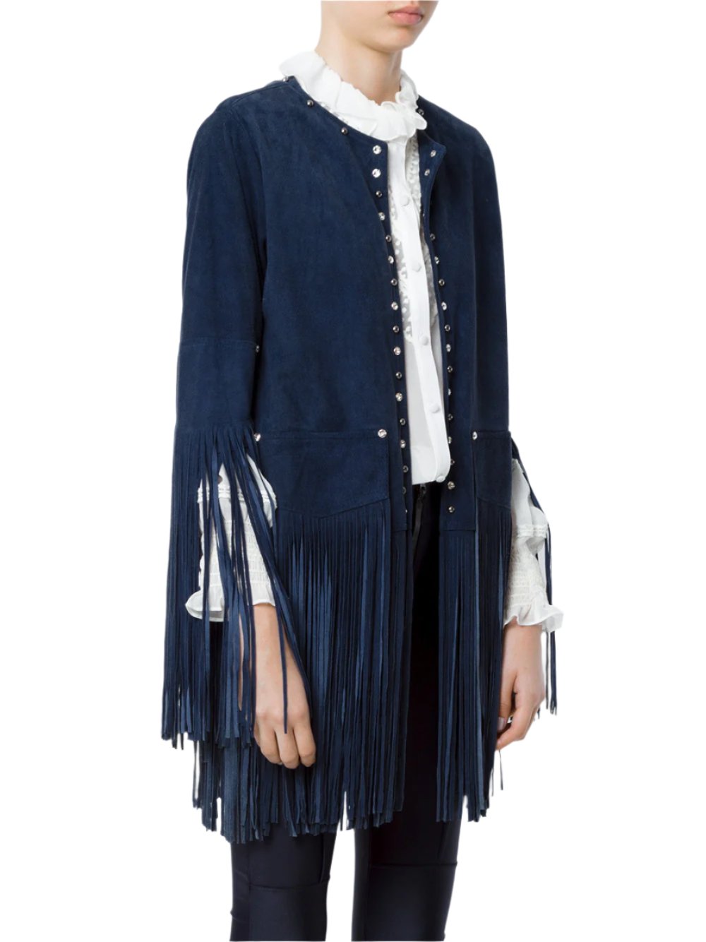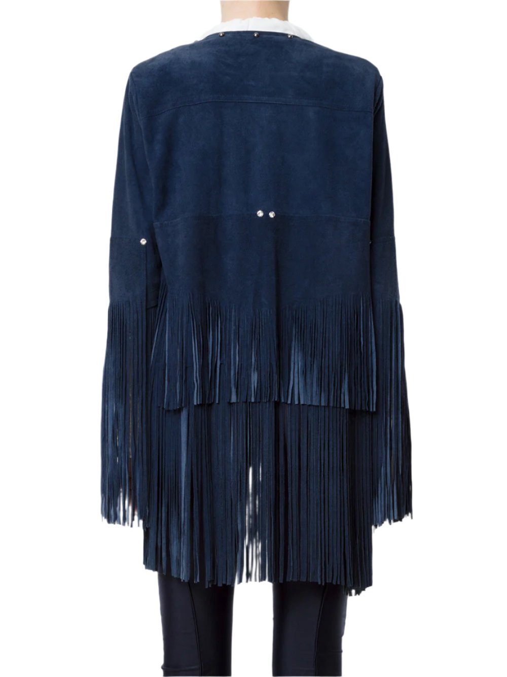 Blue Suede Leather Fringe & Silver Stud Work Jacket For Women WWJ695